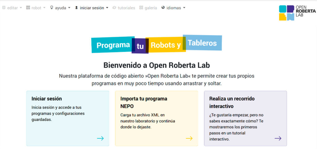Open Roberta Lab es una plataforma de código abierto desarrollada por el Instituto Fraunhofer IAIS de Alemania, orientada a la programación visual de robots y microcontroladores mediante el lenguaje NEPO, basado en bloques de colores. Compatible con LEGO Mindstorms, Arduino, micro:bit y Calliope mini, permite simular el comportamiento de los robots en entornos 2D virtuales personalizables antes de transferir el código al hardware real. Es completamente gratuita, funciona desde el navegador sin instalación, está disponible en más de veinte idiomas y cuenta con una galería de proyectos compartidos. Resulta especialmente valiosa en contextos sin acceso a robots físicos.