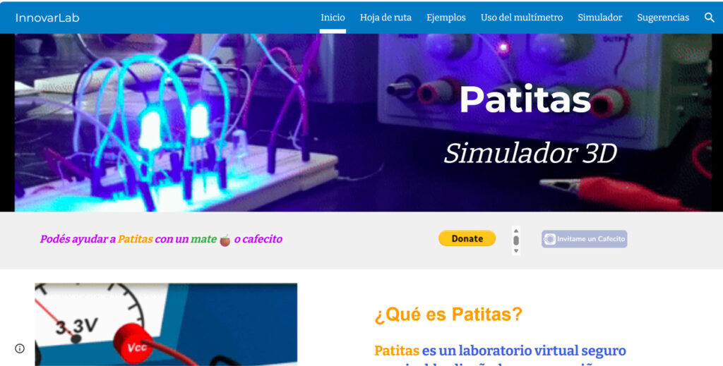 Patitas es un laboratorio virtual 3D diseñado específicamente para que niños y niñas den sus primeros pasos en la electrónica analógica de manera segura y narrativa. Su propuesta pedagógica es singular: los componentes electrónicos y los fenómenos eléctricos se convierten en personajes de una historia, haciendo que la experiencia sea accesible e intuitiva para edades tempranas. Permite armar circuitos mediante bloques de colores que integran el pensamiento computacional, exportar diseños en formatos PNG, JPG y STL para impresión 3D, y construir PCB físicas a partir de los diseños virtuales. Ideal para primaria.